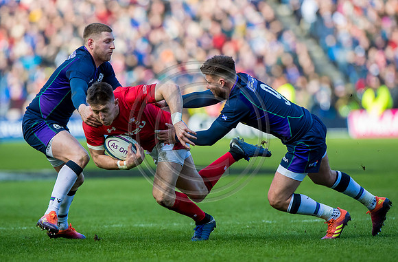 09/03/19 Guinness Six Nations br/BT Murrayfield Stadium - Edinburgh br/Scotland v Wales br/Finn Russell and Ali Price tackle Josh Adams br/Photo credit should read: © Craig Watsonbr/br/br/Craig Watson,br/br/
