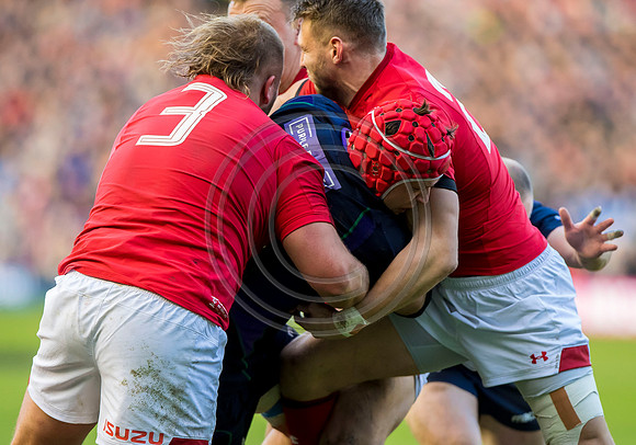 09/03/19 Guinness Six Nations br/BT Murrayfield Stadium - Edinburgh br/Scotland v Wales br/ Tomas Francis and Dan Biggar tackle Grant Gilchrist br/Photo credit should read: © Craig Watsonbr/br/br/Craig Watson,br/br/